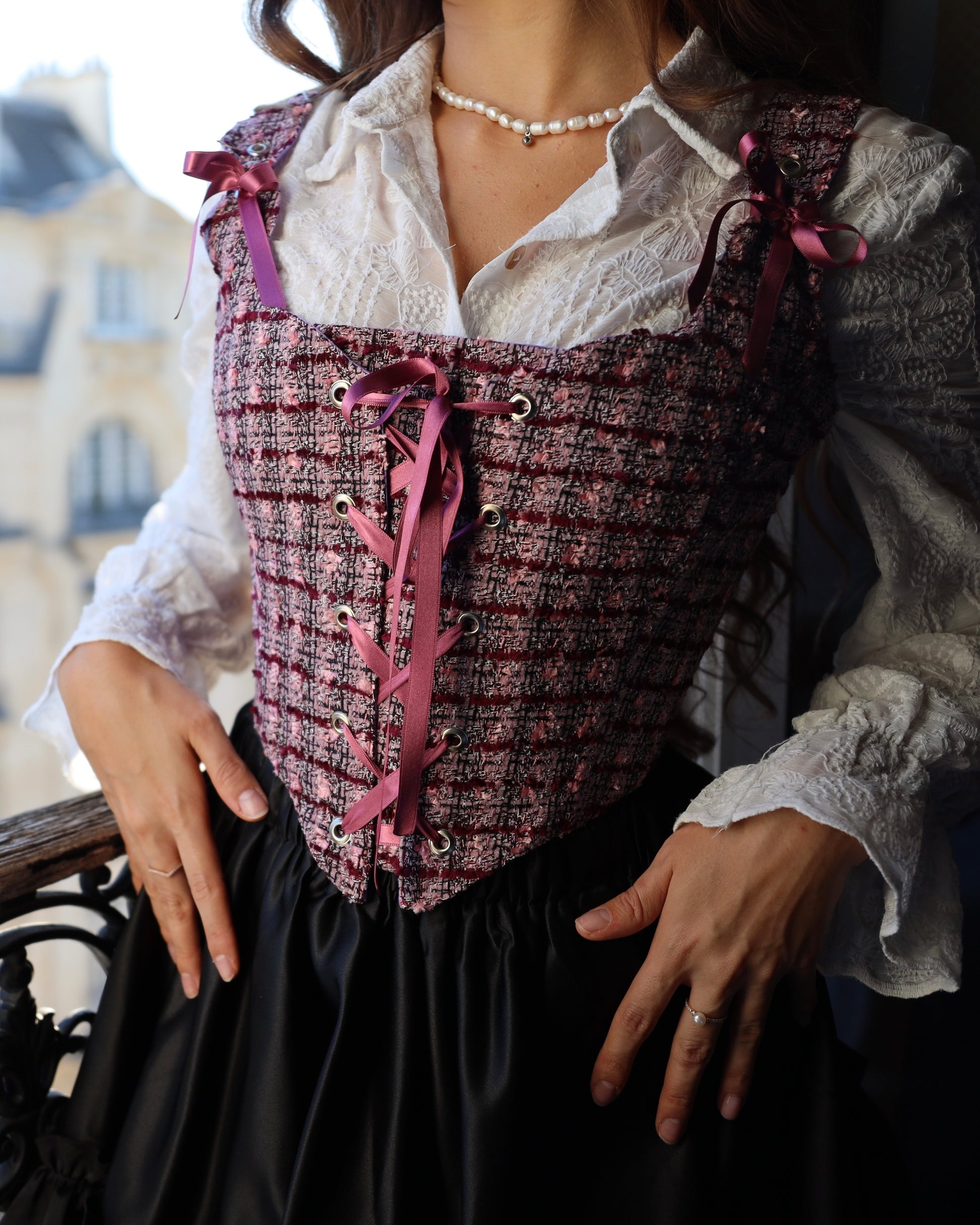 Le Corset Blair incarne le chic audacieux des héroïnes parisiennes. Confectionné dans un tweed raffiné aux nuances de violet profond, réhaussé de fils bordeaux et de touches rosées, il joue avec la lumière pour révéler toute sa richesse visuelle.