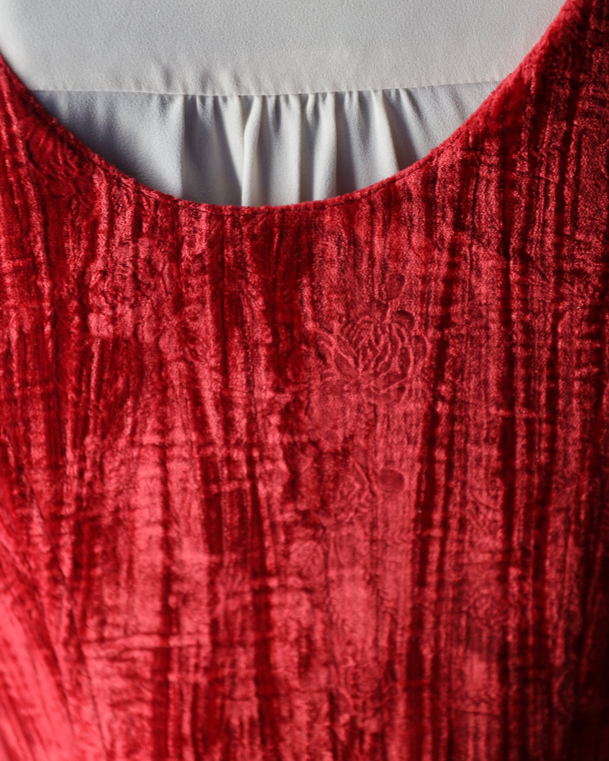 Le Corset Julie est une déclaration de passion et de confiance. Confectionné dans un velours vintage rouge profond, à la fois doux et lumineux, il révèle à la lumière de subtils motifs de roses discrètes, comme un secret caché dans le tissu.
