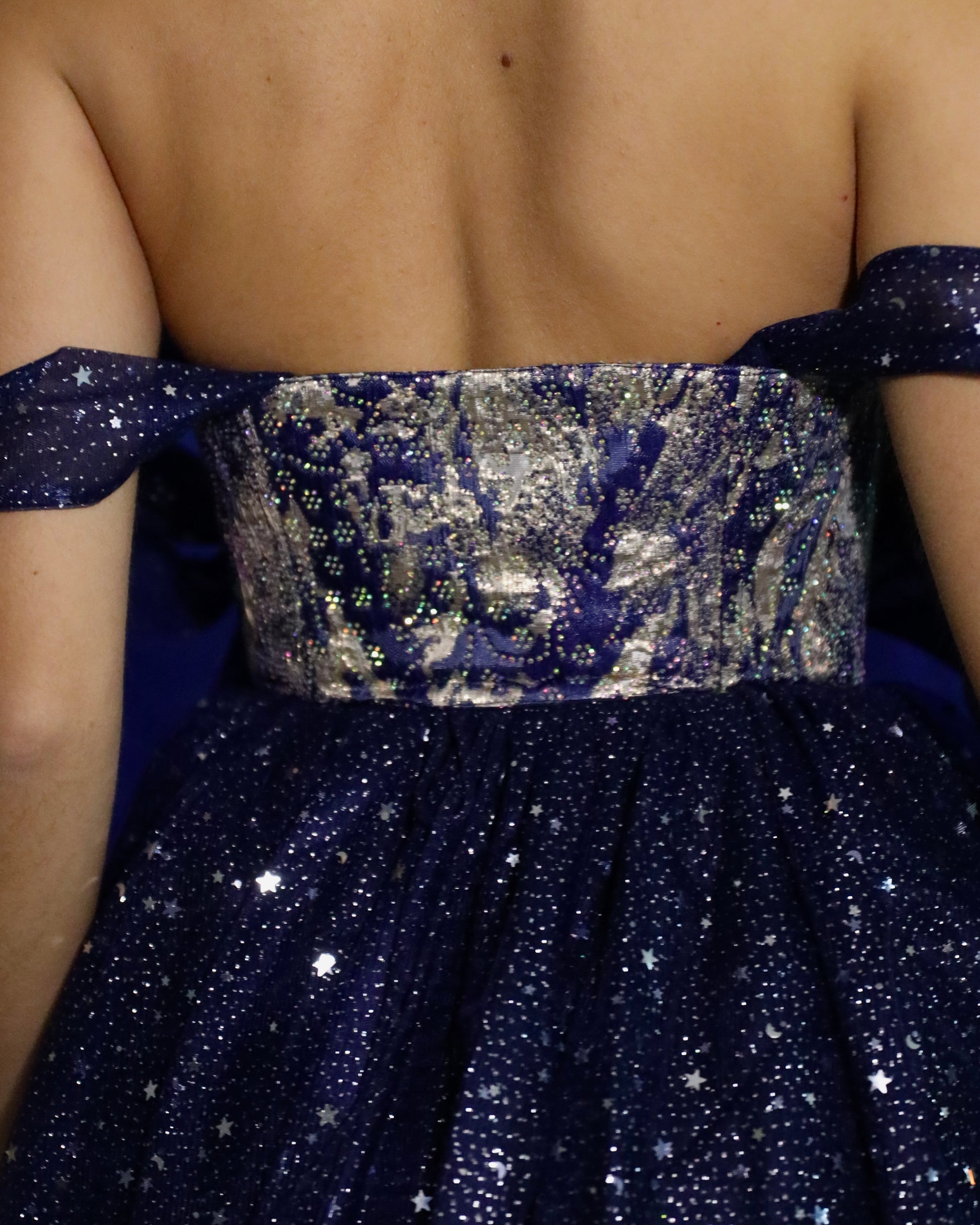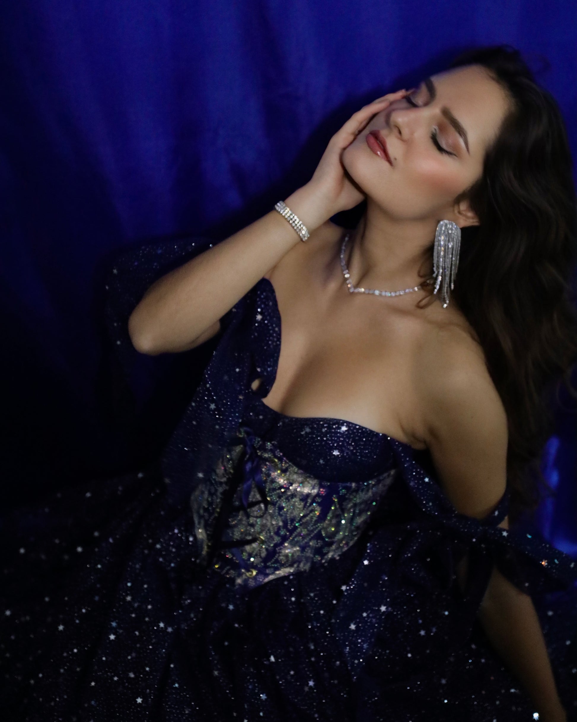 Perle de Nuit est le serre-taille d’exception de la collection La Star. Une pièce éclatante, sculptée dans le même tissu précieux que le corset Nova, constellé de strass et de reflets bleu nuit.