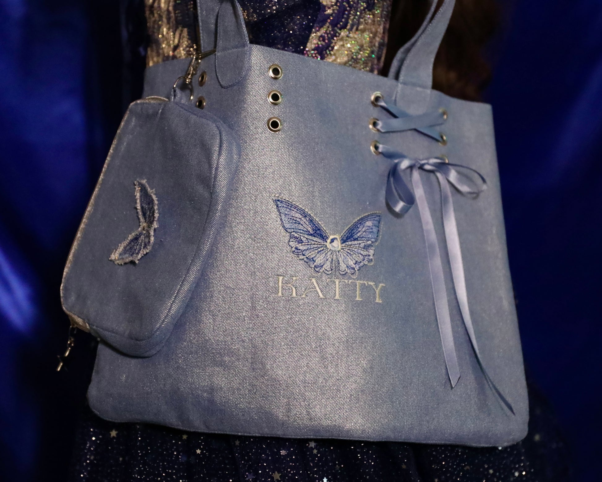 À l’intérieur, vous trouverez une pochette assortie, elle aussi décorée d’une broderie papillon !